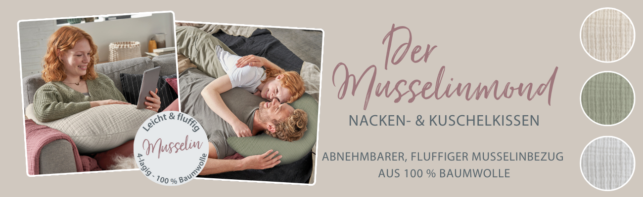 Für den Plüschmond und den Bambusmond – und natürlich auch die Ersatzbezüge – stehen viele schöne Uni-Farbtöne und Melange-Töne zur Wahl – einer schöner als der andere. Dein Kissen lässt sich unkompliziert in einem geschlossenen Wäschesack bei 40 Grad in der Waschmaschine waschen.